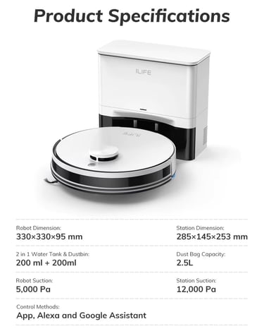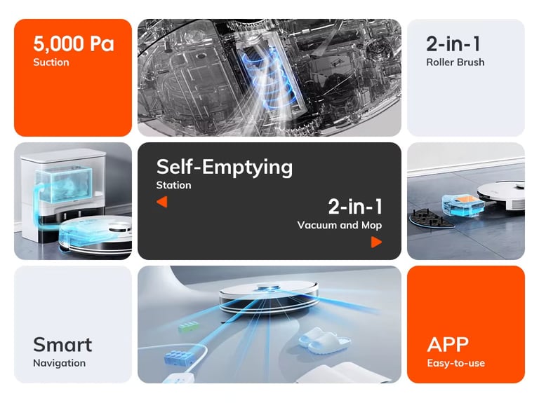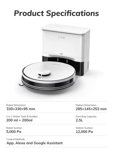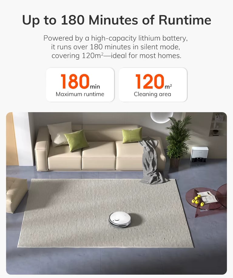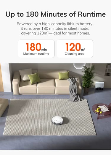 FeatureSpecificationSuction Power5000Pa (4 Levels: Silent, Normal, Strong, Max)NavigationLiDAR 3.0 Laser MappingBattery Life180 Minutes (approx. 2000 sq. ft. coverage)Dust Management2.5L Self-Emptying Station (60-70 days capacity)MoppingElectronic 2-in-1 Hybrid Tank (Y-Shape Scrubbing)Smart FeaturesApp Control, No-Go Zones, Alexa/Google Home, IR Remote
